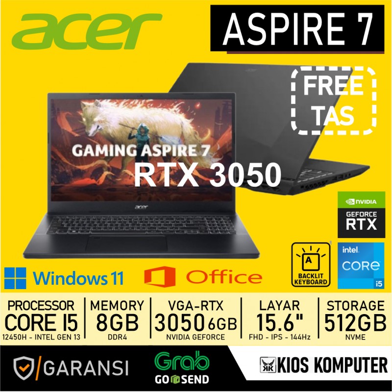 ACER ASPIRE 7 PRO INTEL CORE I5 - 12450H MEMORY 8GB STORAGE 512GB RTX 3050 6GB LAYAR 15.6INCH FHD IPS 144HZ W11 - Kios komputer