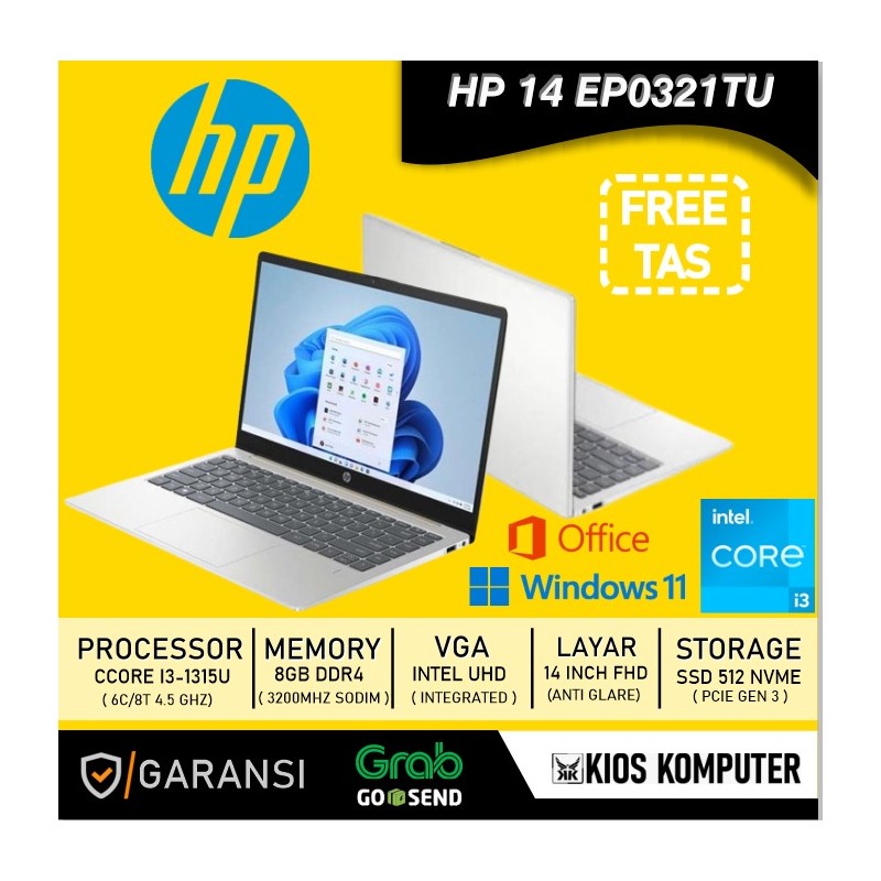 LAPTOP HP 14 EP0321TU INTEL CORE I3 1315U 8GB DDR4 512GB NVME 14 INCH FHD W11 OHS RS(2THN) BP - Kios komputer