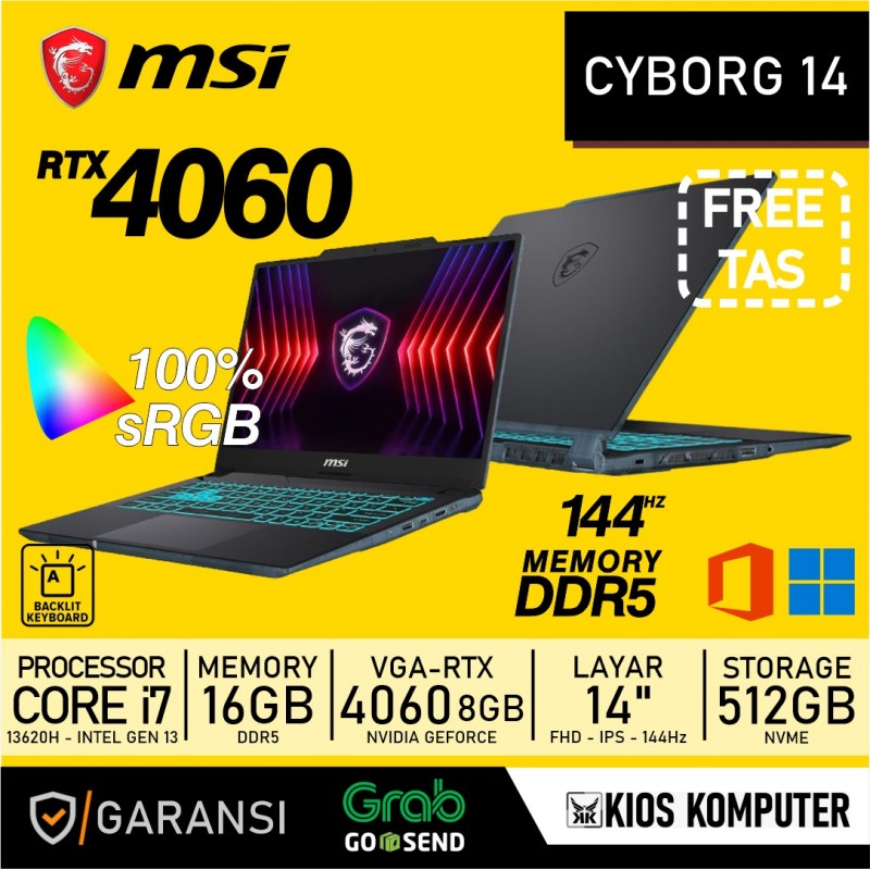 LAPTOP MSI CYBORG 14 INTEL I7 13620H MEMORY 16GB NVME 512GB RTX 4060 8GB W11 + OHS 14INCH FHD 144HZ 100%SRGB - Kios komputer