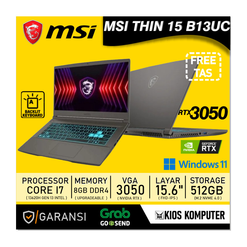 MSI THIN 15 B13UC (9S7-16R831-2407) INTEL CORE I7 13620H 8GB DDR4 512GB RTX3050 4GB 15.6INCH FHD 144HZ W11 - Kios komputer